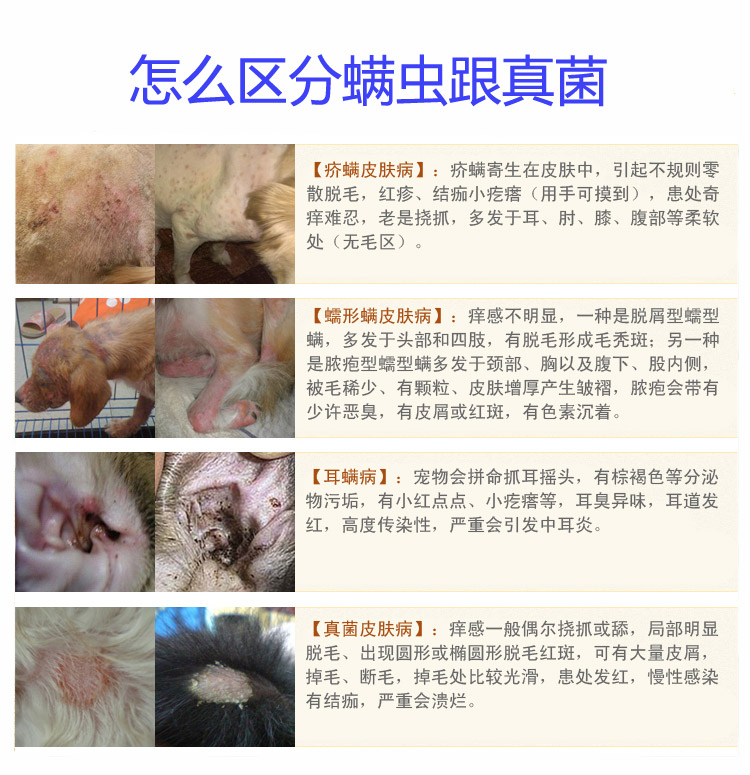 大部分的真菌症状为圆型红斑,明显脱毛,大量皮屑,痒感一般,偶尔挠抓或舔咬。